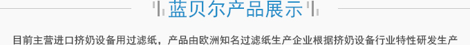 濟南藍貝爾工貿(mào)有限公司主要產(chǎn)品擠奶設備過濾紙,牛奶過濾紙,擠奶機過濾袋,目前主營進口擠奶設備用過濾紙,產(chǎn)品由歐洲知名過濾紙生產(chǎn)企業(yè)根據(jù)擠奶設備行業(yè)特性研發(fā)生產(chǎn),產(chǎn)品符合歐盟食品接觸標準及FDA食品接觸標準,產(chǎn)品在擠奶設備過濾紙行業(yè)占有70%以上的份額。并通過了SGS標準技術(shù)檢測中心按國標食品級標準進行的檢測。產(chǎn)品適用于各種擠奶設備品牌,本公司目前獲得該區(qū)域產(chǎn)品營銷資格。產(chǎn)品已用于國內(nèi)各大乳企所屬牧...